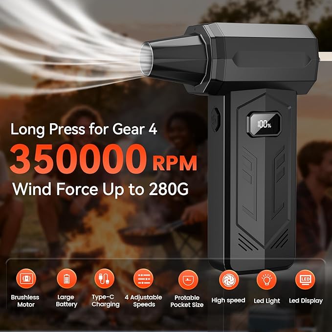 - 【High-Speed】The Air Duster- reaches up to 350,000 RPM, delivering 280G of blowing force with a maximum wind speed of 52 m/s.This electric air blower come with four adjustable speed settings cater to different cleaning needs.Jet dry blower effectively removes dust and debris from keyborad/computer, drying surfaces quickly.