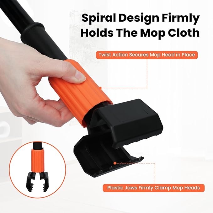 - Quick-Change Jaw Clamp Mopstick -The simple clip-on fastening system allows you to change mop heads in seconds with no tools required and without touching dirty wet mop heads