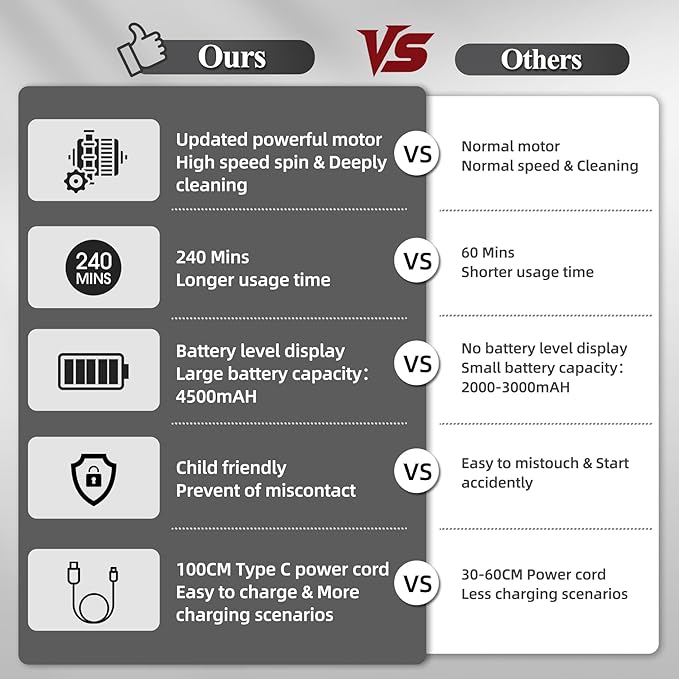 - [Rechargeable & LCD Display]: Our shower scrubber has a built-in 4500mAh large-capacity lithium battery. The low-speed working time to 4.5 hours, the high-speed working time to 4 hours. Equipped with LED display can show the real-time power level, allowing you to charge the product in time to ensure that you can use it at any time. Additionally, our spin scrubber adopts safety lock design can prevent accident contact