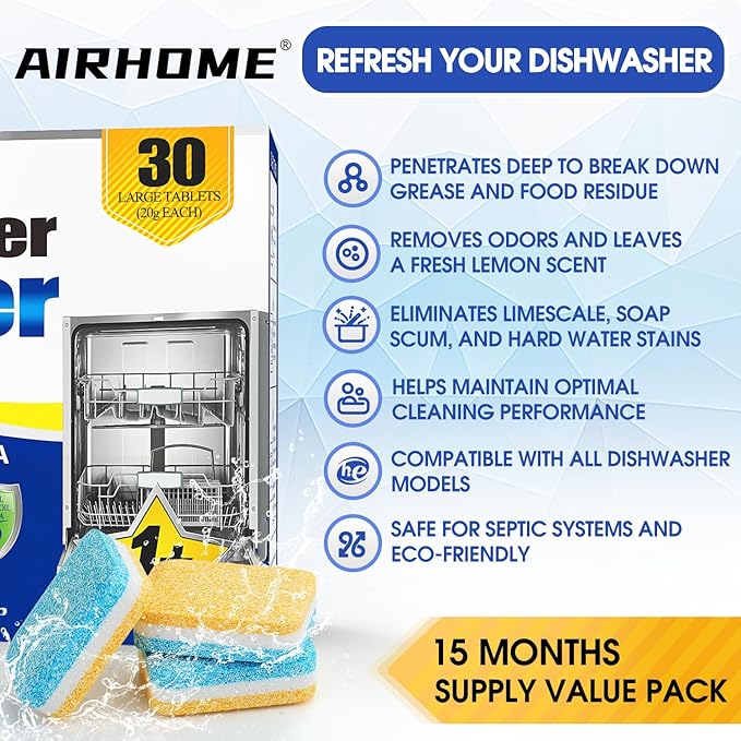 - POWERFUL ENZYME BLEND BREAKS DOWN GREASE & LIMESCALE: Airhome dishwasher cleaner tablets with lipase, amylase, and baking soda dissolve food residue, starch, mineral deposits, and odors.Prevents clogs & Clear foam: Keeps jets, tubes, and filters clean for optimal water flow and a deep clean every time.